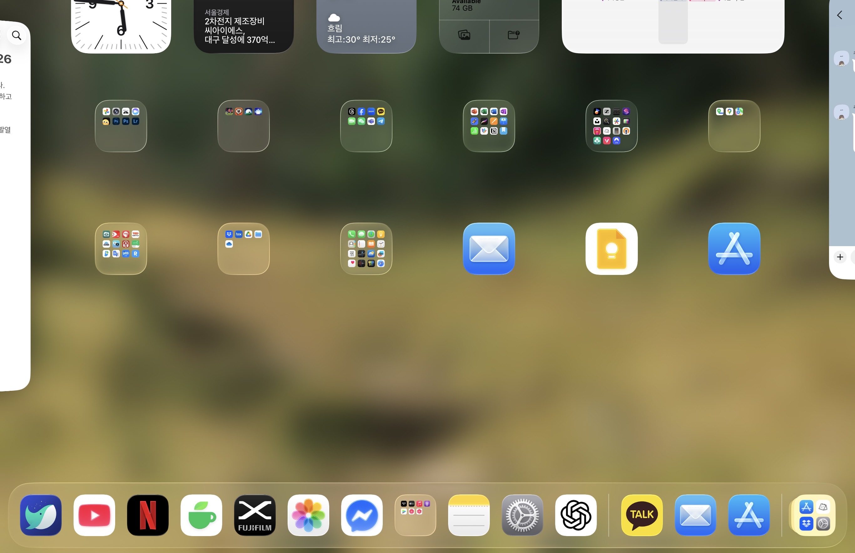 제가 느끼는 불편함은 멀티태스킹으로 앱 사용 중 그냥 배경화면으로 나가고 싶은데, 아래와 같이 멀티 테스킹 혹은 전체화면 다른 앱 실행을 하기 위해 현재 실행중인 앱을 플로팅 시켜놓고 대기하고 있더라구요. 순수 배경화면으로 나가기 위한 방법이 없는 듯합니다. 제가 못찾는 걸 수도 있구요.