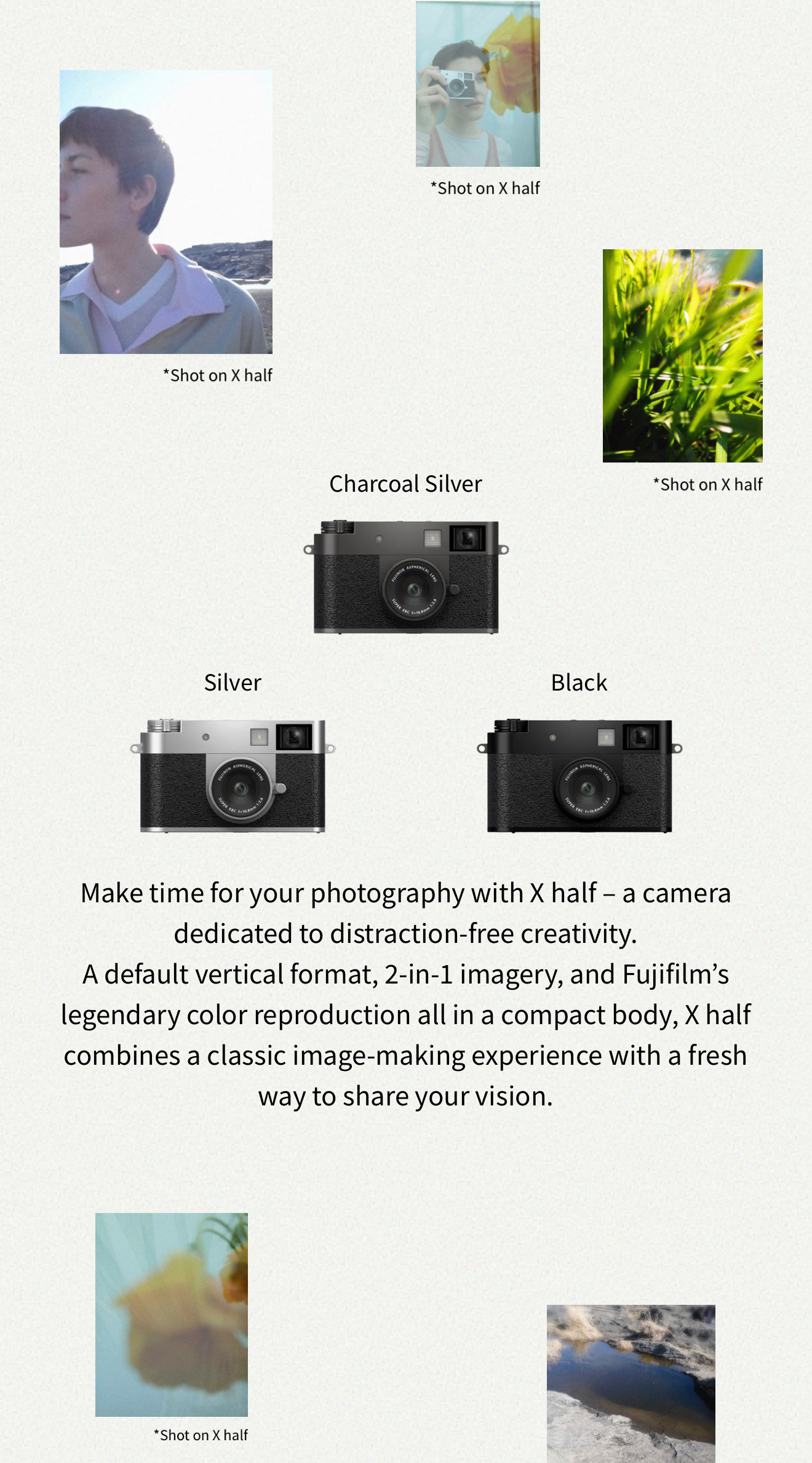 후지필름 X-Half는 디지털의 편의성과 아날로그의 감성을 결합한 독특한 카메라로, 세로형 콘텐츠 제작에 최적화되어 있습니다. 특히 Film Roll Mode와 다양한 필름 시뮬레이션 기능은 필름 카메라의 촬영 경험을 디지털로 재현하고자 하는 사용자에게 매력적인 선택지가 될 것입니다. 다만, RAW 촬영이나 고급 영상 기능이 필요한 사용자에게는 다른 대안 제품을 고려해보는 것이 좋습니다.