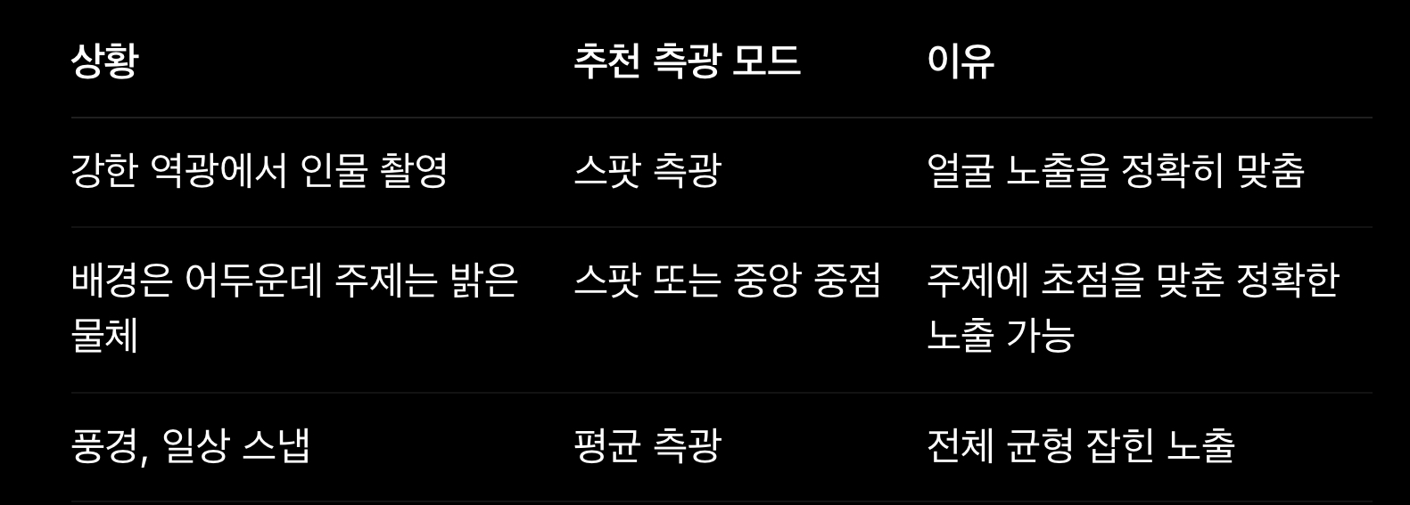 많은 촬영 상황에서 기본 설정(평균 측광)으로도 충분하지만, 다음과 같은 경우엔 측광 모드를 바꾸는 게 큰 차이를 만듭니다: